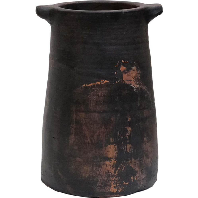 Dieser Tontopf ist handgefertigt mit einem rustikalen und abgenutzten patinierten Look, der ihm einen authentischen und zeitlosen Ausdruck verleiht. Die zylindrische Form des Topfes und die kleinen Griffe oben schaffen eine traditionelle Form, die an historische Keramik erinnert. Die dunklen und erdigen Farben der Oberfläche, die von Schwarz bis zu Brauntönen reichen, verleihen dem Topf einen Vintage-Look. Der Topf wird sicherlich Charme und Charakter in jede Einrichtung bringen, in der Sie einen authentischen Akzent setzen möchten.